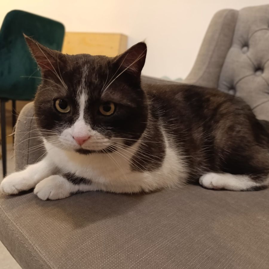 Hij kan alleen geadopteerd worden. Indien er reeds een rustige kat aanwezig is binnen het gezin, kan hij ook daar terecht.